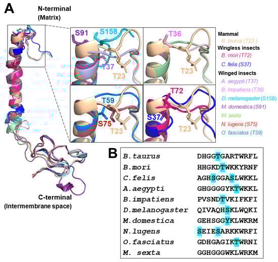 The tridimensional structure models of insect COXVIa: (A) overlay of nine structure models of insects COXVIa modeled in the Phyre 2 server using the primary sequence as input, normal modeling mode and the B. taurus crystal structures (PDB 1V54 or 3WG7) as templates [171]. All structures were aligned from the mitochondrial matrix N-terminal on the top to the C-terminal at the intermembrane space at the bottom. The structure models were analyzed using Pymol software and colored as shown in the figure. The positional conservation of the Ser and Thr residues at the beginning of a transmembrane helix is highlighted and shown in the inset boxes. (B) Primary sequence alignment fragment representing the beginning of COXVIa transmembrane helix. The highlighted Ser, Thr, and Tyr residues represent the NetPhos predicted P-sites.