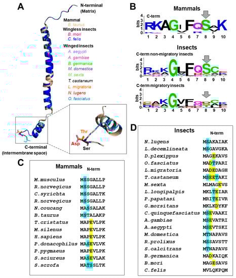 The tridimensional structure models of COXVIc in insects: (A) overlay of structure models of COXVIc from 11 insect species modeled in the Phyre 2 server using the primary sequence as input, normal modeling mode and the B. taurus crystal structure (PDB: 1V54) as a template [171]. All structures were aligned from the mitochondrial matrix N-terminal on the top to the C-terminal at the intermembrane space at the bottom. The structure models were analyzed using Pymol software and colored as shown in the figure. The conserved Ser residue at C-terminal is highlighted and shown in the box. Remarkably, the migratory insect species (L. migratoria and N. lugens) have a Thr or Asp instead of Ser residue, respectively. (B) WebLogo of a C-terminal region of mammals (top panel), nonmigratory insects (middle panel), and migratory insects (bottom panel). The WebLogo position 8 shows the conserved Ser for mammals (position 71 at B. taurus 1V54) and nonmigratory insects, while migratory insects also have Thr and Asp residues. The N-terminal of mammalian (C) and insects (D) COXVIc demonstrate the abundance of Ser and Thr with predicted phosphorylation sites (cyan) together with the phosphomimetic Asp or Glu (yellow).