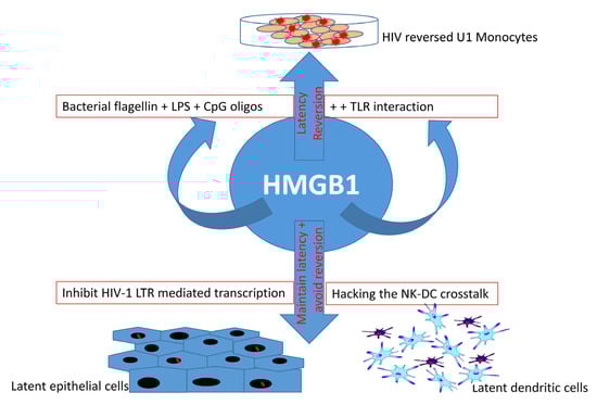 Dual role of HMGB1 in HIV latency. HMGB1 protein not only helps maintain viral latency in epithelial cells and dendritic cells, but also helps reverse HIV latency in U-1 monocytes. This reversal is associated with TLR interaction with bacteria-derived molecules (flagellin, LPS, and CpG oligos) that play a major role in HMGB1-associated reversal, suggesting the importance of foreign (bacterial) components in HIV reversal. However, as an indication of a dual role of HMGB1 protein family, latency is maintained and its reversion is prevented through the inhibition of HIV-1 LTR-mediated transcription and hacking the natural killer (NK) cells and dendritic cell (DC) crosstalk in latent epithelial cells and dendritic cells, respectively.