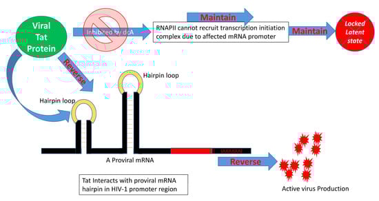 HIV Tat protein and latency reversal. Tat protein can reverse HIV latency by interacting with the promoter region of the HIV genome through recruiting RNAPII and associated transcription initiation complex. This process is affected by didehydro-cortistatin A (dCA). When RNAPII becomes unable to interact with the HIV mRNA hairpin loop, the latency reversal is halted. A thorough investigation of the roles of individual viral proteins in HIV latency reversal is thus very important for understanding their critical role in HIV cure.