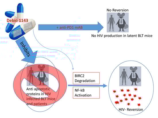 Inhibition of anti-apoptotic proteins reverses HIV latency. Debio 1143 (an IAP inhibitor) inhibits anti-apoptotic proteins such as BIRC2, which activates NF-κB-mediated HIV reversal. HIV latency can be markedly reversed in ART-treated BLT mice and human subjects when treated with Debio 1143. On the other hand, Debio 1143, when combined with anti-PD1 monoclonal antibody (mAb), can reduce HIV production and latency reversion in BLT humanized mice in most tissues (spleen, lymph nodes, liver, lungs, and thymic organoids). The dual role of chemical agents in HIV reversal/maintenance is thus intriguing and warrants further investigation.
