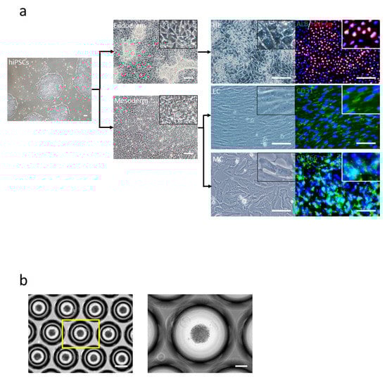 We generated HE, EC, and MC from hiPSCs, as described previously [,] (Figure 1a). These results showed that HE cells were HNF4α (Hepatocyte nuclear factor 4 alpha)-positive, EC were CD31 (platelet endothelial cell adhesion molecule-1, PECAM-1)-positive, and MC were CD166 (activated leukocyte cell adhesion molecule, ALCAM)-positive (Figure 1a). Furthermore, we generated liver buds as per the protocols described previously [] (Figure 1b). We checked for the generation of small liver buds in the Elplasia plate and reseeded these liver buds in the cell culture insert.