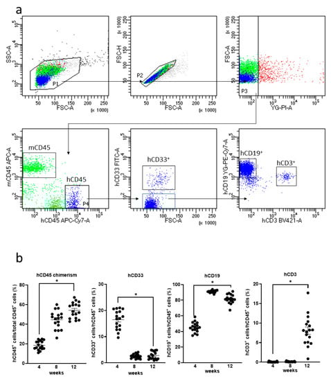 - Shultz, L.D.; Saito, Y.; Najima, Y.; Tanaka, S.; Ochi, T.; Tomizawa, M.; Doi, T.; Sone, A.; Suzuki, N.; Fujiwara, H.; et al. Generation of Functional Human T-Cell Subsets with HLA-Restricted Immune Responses in HLA Class I Expressing NOD/SCID/IL2rγnull Humanized Mice. Proc. Natl. Acad. Sci. USA 2010, 107, 13022–13027. [Google Scholar] [CrossRef] [PubMed]