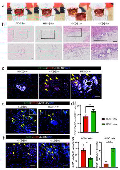 hiPSC-derived liver buds were transplanted to the surface of the murine liver as per the protocols described previously [] (Figure 3a). The transplanted tissues were attached in all groups, as observed one and four weeks after transplantation. Hematoxylin and eosin staining showed the presence of HE-derived hepatocyte or bile duct clusters in the transplanted grafts (Figure 3b). In the NOG-HLA-A2Tg HSC-transplanted group (HSC(+)), more inflammatory cells were observed around the transplanted graft compared to the HSC(−) group (Figure 3b). Immunohistochemistry was conducted to determine whether the immune cells were derived from humans or mice (Figure 3c). The inflammatory cells that invaded in NOG-HLA-A2Tg HSC(+) were human CD45+ (Figure 3c). These human CD45+ cells increased one-to-four weeks after transplantation (Figure 3d). Next, we checked the characteristics of the hCD45 cells to determine whether these cells were T cells, monocytes, or NK cells. These cells were almost all T cells (CD3+ cells), with a few monocytes (CD14+ cells) (Figure 3e). One week after transplantation, an invasion of cytotoxic T cells (CD3+ and CD8+) was observed (Figure 3f,g). We also detected helper T cells (CD3+ and CD4+) around the transplanted graft (Figure 3f).