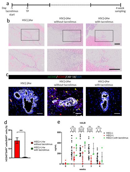 Tacrolimus was administrated five days before transplantation in the NOG-HLA-A2Tg HSC(+) group (Figure 4a). Four weeks after transplantation, inflammatory cell invasion decreased around the transplanted hiPSC liver bud in the tacrolimus(+) group compared to the HSC(+) tacrolimus(−) group (Figure 4b). Immunohistochemistry results showed less human CD45+ cell invasion in the tacrolimus(+) group compared to the tacrolimus(−) group (Figure 4c,d). The serum human albumin concentration in the HSC(+) tacrolimus(+) group was higher than the HSC(+) tacrolimus(−) group, as well as in the HSC(−) group, which indicates that the suppression of allograft rejection was partially achieved by administering tacrolimus (Figure 4e).