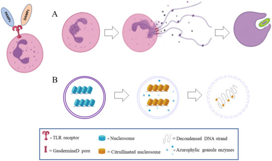 Molecular mechanism involved in the neutrophils extracellular traps (NETs) formation process. Following pathogen-associated molecular patterns (PAMPs) or damage-associated molecular patterns (DAMPs), molecules binding to toll-like receptors (TLR) in a neutrophil granulocyte several steps characterizing the evolution, formation, and extrusion of NETs. (A) Cytoplasmatic events: cytoplasm granules are shifted into the nucleus for decondensing DNA, the nucleus loses its integrity, and NETs meshwork is released in the extracellular space by gasdermin D pores. After NETs extrusion, the granulocyte preserves its phagocytic ability for some hours. (B) Nuclear events: nuclear DNA-histones is was decondensed by azurophilic granulocyte enzymes, then linker H1 histone is cleaved off and histone 3 and 4 are citrullinated, inducing DNA decondensation.