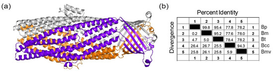 Burkholderia cepacia complex species harbor the Bucl8 ortholog, designated Bucl8-BCC, which lacks the extracellular CL-Ct region. The Bucl8-BCC variant in B. cenocepacia J2315 has a 35% protein sequence identity to the corresponding barrel regions of the VceC protein. Given the lack of structural information on this protein, we filled this gap using homology modelling and the structure of VceC as a template, Figure 2a. Similar to Bucl8 in Bpc complex species, Bucl8-BCC structure presents the characteristic periplasmic α-helical barrel and outer membrane β-strand barrel. Bucl8-BCC sequences were identified in 29 completely sequenced BCC genomes deposited in NCBI database. Multiple sequence alignment of these Bucl8-BCC variants in the region from the starting Cys residue until the end of the sequence encoding the α-helical and β-strand barrels of the mature Bucl8-Bpc protein (residues 1–459) is reported in Figure S1. Within the 41 genomes, 72.8% of residues of Bucl8-Bpc and Bucl8-BCC were conserved, and the conservation increases within each Bpc and BCC genomes. As a representation of the full alignment, Figure 2b shows the percent identity/divergence of B. pseudomallei (Bp) 1026b, B. mallei (Bm) ATCC 23344, B. thailandensis (Bt) E264, B. cenocepacia (Bcc) J2315, and B. multivorans (Bmv) ATCC BAA-247, which are representative BCC species with highest incidence of human infection. In the Bpc group, Bucl8 sequences of B. pseudomallei, B. mallei, and B. thailandensis have ≤5% divergence, whereas the Bucl8-BCC sequences have ≤5.9% divergence. Between all 41 isolates, there was ~78% conserved residues between Bucl8-Bpc and Bucl8-BCC sequences.