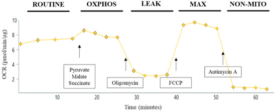 Measurements of bioenergetics in platelets were completed using a Seahorse XFe96 Flux Analyzer (Agilent Technologies, Santa Clara, CA, USA). The OCR was measured in the presence of substrates, inhibitors, and uncouplers related to OXPHOS as modified from previously described methods [42,43]. The day before the planned experiment, the sensor cartridge of Extracellular Flux kit was filled with 200 µL deionized water and kept at 37 °C overnight. At least 30 min prior to use, the water was removed, the plate filled with 200 µL XF calibrant solution and put back at 37 °C. The injection ports, A to D of the sensor cartridge, were loaded separately or in combinations of substrates/inhibitors/uncouplers to measure different states of respiration. Before loading, the stocks were diluted appropriately in PPG buffer such that after each sequential injection, the final concentration of the modulators was 5 mM pyruvate, 2.5 mM malate, and 10 mM succinate (via Port A), 5 µM oligomycin A (via Port B), 4 µM FCCP (via Port C), and 1 µM antimycin A (via Port D). Either 10 or 30 µg total platelet protein (approximately 1 × 107 or 3 × 107 platelets) was loaded per well on a Seahorse XFe96 assay plate in a total volume of 30 µl (platelet sample plus PPG buffer). The assay plates were centrifuged at 2100× g for 4 min at RT. Additional pre-warmed PPG buffer was added to bring the starting volume to 175 µL. After the calibration step, the utility plate was replaced by the assay plate carrying platelet samples. Seahorse Standard XFe96 flux assay plates were utilized for platelet analysis. Oxygen consumption rates (OCR) and extra-cellular acidification rate (ECAR) were recorded in the absence or the presence of various substrates/inhibitors which were added from port A to port D. These measurements were performed on intact (non-permeabilized) platelets. Basal readings were performed in the presence of glucose in the buffer. OXPHOS, LEAK, MAX, and non-mitochondrial (NON-MITO) oxygen consumption respiration rates were recorded based on subsequent port injections (Figure 1). Basal glycolysis was measured as ECAR in the presence of glucose without substrate addition. Maximum glycolysis was measured as ECAR after the addition of oligomycin according to the injection paradigm in Figure 1. Platelet coupling efficiency was calculated by OXPHOS/LEAK, while glycolytic reserve capacity was calculated by Max glycolysis-Basal glycolysis. Raw OCR and ECAR values were used for analysis within a given experiment and reported in all figures.