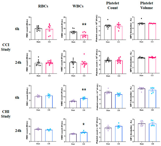 Similar to our previous reports [37], a single CHI resulted in an immediate apnea response (17.2 ± 3.0 s) and an increase in time to right after a 10-minute sustained bout of anesthesia (CHI: 5.0 ± 1.3 min vs. Sham: 1.3 ± 0.1 min). RBC counts were unchanged early after CHI (Figure 2). However, we found significantly higher leukocytes counts in the blood following CHI at both 6 and 24 h post-injury, compared to sham. This may be an indication of a delayed immune response in the brain or leukocytosis induced by diffuse mild TBI. We show that platelet counts and MPV are not changed at either 6 or 24 h following CHI.
