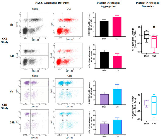 Platelet-leukocyte aggregates are indicative of the thromboinflammatory response following cerebral trauma [44]. Platelet-neutrophil aggregates (PNAs) represent the vast majority of platelet-leukocyte aggregates; as such, PNAs have been shown to increase following acute ischemic stroke [45]. Although we find that PNA levels are not significantly different at either 6 or 24 h after CCI compared to sham, the change in PNAs between these early time points was significantly different between sham and CCI (Figure 3).