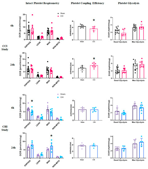 After CHI, platelets displayed lower OXPHOS levels at 6 h post-injury compared with sham (Figure 4). By 24 h, however, platelets from mice with CHI exhibit significantly higher MAX respiration levels compared to those from sham mice (Figure 4). Neither platelet coupling efficiency nor platelet glycolysis (Figure 4) changed acutely after CHI.