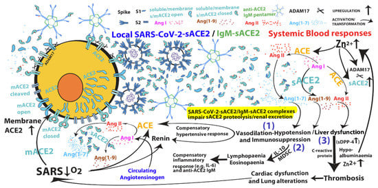 SARS-CoV-2 induced positive feedback loops mediated by RAS activation and pathophysiological consequences of the systemic excess of soluble ACE2 enzyme (sACE2). Upon spike protein binding to ACE2, ACE2 shedding leads to systemic upregulation of downstream pathways that can sustain positive feedback loops at different levels: (1) hypotensive effects mediated by Ang II catabolism can subsequently induce compensatory hypertensive response mediated by renin and ACE upregulation providing new Ang II for further Ang (1–7) production by ACE2; (2) Ang (1–7) antiproliferative and apoptotic effects, possibly through IL-10, may mediate eosinopaenia and lymphopaenia that impair immune system ability to counter virus infection and subsequently induce compensatory inflammatory responses; (3) liver dysfunction that, on one hand, increases plasma bioavailable Zn2+ (fuel for ACE, ACE2 and ADAM17 zinc-metalloprotease activities) due to reduced albumin (hypalbuminaemia) binding/sequestration of Zn2+, on the other hand, can produce procoagulant factors (e.g., C-reactive protein) leading to disseminated microvascular thrombosis, local hypoxic conditions (e.g., in heart and lungs) and consequent systemic hypoxia, which, in turn, upregulates renin, ACE and ACE2 syntheses and, therefore, peptide production of both arms of the RAS (i.e., Ang I, Ang II, Ang (1–7) and Ang (1–9)). Notably, upregulation of ACE2 synthesis increase membrane ACE2 (mACE2) expression that finally gives more chances to SARS-CoV-2 cell entry. Finally, both SARS-CoV-2 virions and anti-ACE2 non-neutralising IgM antibodies may increase ACE2 shedding and systemic activity, and sACE2-virion and sACE2-IgM complexes may impair the removal of systemic ACE2 enzymatic activity (for details see reference []).