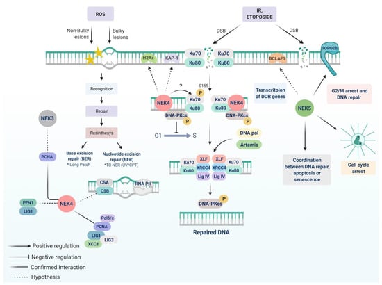 NEK3, NEK4, and NEK5 roles in DDR. The interaction of NEK3 and PCNA is a possible link between NEK3 and DDR. NEK4 interacts with the DNA-PK complex and is important for efficient DNA-PKcs recruitment to DNA damage foci, as well as the activation of pathways essential to induce cell cycle arrest after DSBs with IR or etoposide. We propose that NEK4 acts very early in DNA break recognition, phosphorylating Ku70 (possibly at S155 residue) and stabilizing the DNA-PK complex. Also, NEK4 possibly interacts with other NHEJ-related proteins, such as H2AX, and KAP-1, and PCNA, and FEN1. The interaction between NEK5 and topoisomerase IIβ might be related to cell cycle halting due to DNA damage, as this interaction increases during the first stage of DDR. NEK5-depleted cells overcome the G2/M checkpoint upon DNA damage, indicating that NEK5 is required for an appropriate DDR.