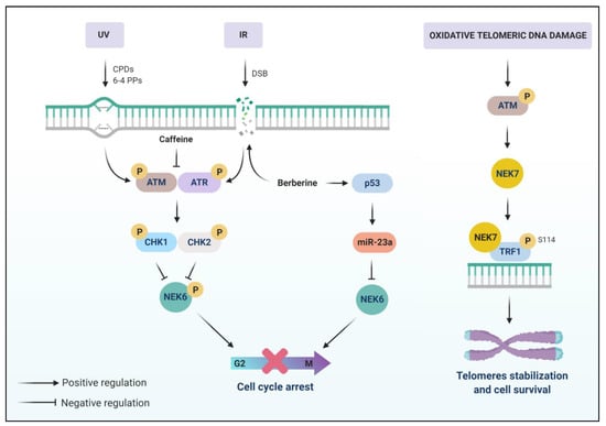 The possible involvement of NEK6 and NEK7 in DDR. NEK6 kinase activity is inhibited by ATM/ATR-Chk1/Chk2 caffeine-sensitive signaling pathway after DSBs induced by IR and UV treatment. NEK6 kinase activity inhibition by DDR is necessary for G2/M arrest. NEK6 is repressed by miR-23a, which is induced by berberine, a genotoxin that increases the accumulation of DSBs, in a p53-dependent manner. NEK7 is related to a protective function of telomeres in response to oxidative DNA damage. ATM activation mediates the function of NEK7 in telomeres. NEK7 is recruited to the telomeres and binds and phosphorylates TRF1 in S114, preventing its degradation. The integrity of telomeres is linked to the stability of TRF1.