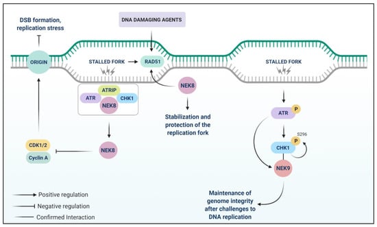 Signaling pathways involving NEK8 and NEK9 in response to replication stress. NEK8 prevents DSB accumulation by suppressing cyclin A-associated CDK activity. NEK8 interacts with ATR, ATRIP (ATR-interacting protein), and CHK1 proteins after DNA damage and is important for the progression of replication forks. NEK8 also regulates RAD51 foci formation upon DNA damage. NEK9 is a replication stress response (RSR) protein since agents involved in replication stress increase its expression. NEK9 interacts with CHK1 and its knockdown decreases CHK1 autophosphorylation (S296) and its kinase activity in response to replicative stress.