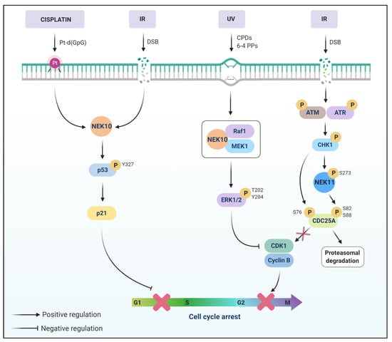 DNA damage induces cell arrest in the G1, S, or G2 phase of the cell cycle, depending on the phase in which the damage is sensed, allowing the cells to repair their damaged DNA [,]. Based on the fact that NEK2 regulates the separation of the centrosomes during the G2 phase, Fletcher et al. (2004) demonstrated that NEK2 activation and expression are decreased in response to radiation in HeLa cells []. Moreover, NEK2-induced centrosome splitting is also inhibited after irradiation in a dose-dependent manner and in different cell lines, as well as in response to other DNA-damaging agents such as etoposide. Thus, NEK2 might act as a downstream target of the DDR pathway and decreased NEK2 activity after irradiation inhibits centrosome separation and contributes to the G2 arrest [].