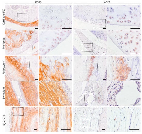 In the PGPS model, 6 rats were randomly taken from their cages and local synovitis was induced by priming their left joint (experimental joint) by an intra-articular injection of 25 µL PGPS (100 P fraction with 5 mg rhamnose/mL PGPS; Lee Laboratories, Grayson, GA, USA) at a concentration of 0.17 mg/mL, under general isoflurane anesthesia (day 14) [30]. At days 0, 14, and 28 synovitis was reactivated in the experimental knee joints by intravenous injection of 500 µL of PGPS (0.28 mg/mL PGPS) via the tail vein. Animals were euthanized after 6 weeks with CO2. For the ACLT model, OA was induced unilaterally through anterior cruciate ligament transection and partial medial meniscectomy in the left knee of 6 rats that were randomly taken from their cages, under general isoflurane anesthesia [31]. After 16 weeks, rats were euthanized with CO2.