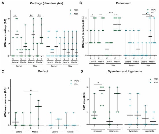 OSM expression scores in two rodent models of acute arthritis and instability induced OA. OSM score per anatomical structure: cartilage (chondrocytes) (A), periosteum (B), meniscus (C), synovium, and ligaments (D). Control (C), Induced (I). 0 = no staining, 1 = slight staining, 2 = moderate staining, 3 = extensive staining. Each individual datum point represents a rat knee. Squared symbols (green) refer to the PGPS model. Circular symbols (blue) refer to the ACLT model. Data are presented as median and 95% CI. (* p < 0.05, ** p < 0.01, and *** p < 0.001).
