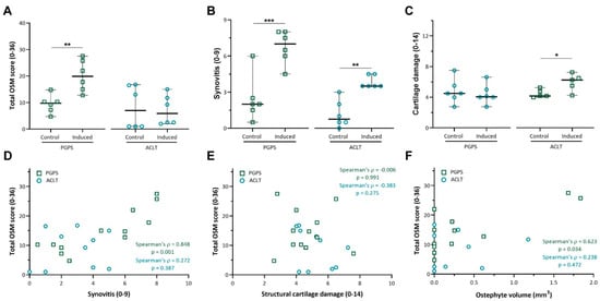 Furthermore, the total OSM score strongly correlated with synovitis in the PGPS model (ρ = 0.848, p = 0.001, Figure 4D), but not in the ACLT model (ρ = 0.272, p = 0.387, Figure 4D). No correlation was found between OSM expression and cartilage damage in either model (Figure 4E).