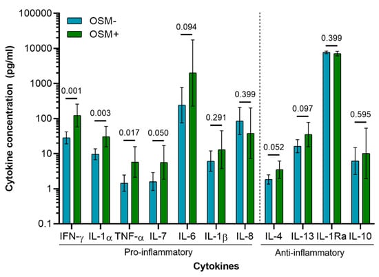 OSM was detected in the synovial fluid of 6 out of 27 patients (OSM+), and was undetectable in 21 patients (OSM−). The concentration of OSM showed a positive and significant correlation with the concentration of other pro-inflammatory cytokines, namely IL-1α (ρ = 0.461, p = 0.016), TNF-α (ρ = 0.481, p = 0.011), and IFN-γ (ρ = 0.573, p = 0.002) (Table S3). A generalized linear mixed model was conducted with and without explanatory variables (OSM grouping) to assess differences in cytokine expression pattern between OSM+ and OSM− patients. A likelihood ratio test between the two models indicated significant difference in cytokine expression patterns between the two patient groups (χ2 (11) = 43.48, p < 0.0001). The lowest p values between patient groups were observed for pro-inflammatory cytokines (IFN-γ, IL-1α, and TNF-α), while no significant differences were observed for any of the anti-inflammatory cytokines (Figure 5 and Table S4).