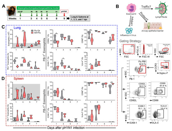 Influenza is an infectious disease of the respiratory system that has claimed millions of lives over the past century. Although antiviral therapies and vaccines are now available, influenza viruses are a moving target for the immune system, as well as for the pharmaceutical industry, as they evolve through antigenic drifts, shifts, and re-assortment [16], and continue to be a major public health threat. Intriguingly, a pooled analysis of clinical reports showed that asthmatics fared better during the Swine Flu pandemic of 2009 [12,17,18,19,20,21]. We effectively modeled this phenomenon in mice to show that allergic animals have altered pathophysiologic and immune responses at both the early and late phases of IAV infection [22]. Allergic animals clear the virus sooner than their non-allergic counterparts and have more robust (and specific) CD8+ T cell responses [22]. This led us to investigate a possible link between the eosinophil-dominant early immune response and enhanced cellular immunity, and uncover a novel function for eosinophils as mediators of enhanced antiviral CD8+ T cell responses [23], which included epigenetic modifications [24]. Based on these findings, we hypothesized that eosinophils undergo temporal phenotypic and functional changes in response to IAV that license their retrograde migration out of the lungs, where the infection occurs, to the draining lymphoid organs to maximize cellular immune defenses, including the activation of CD8+ T cells [23]. Here, we investigated eosinophil responses to early stages of IAV infection using our mouse model in the context of migration and trafficking, barrier protection, and virus inhibition (Figure 1A,B) utilizing both in vitro and in vivo platforms. We found that eosinophil activation and adhesion molecules were dynamically regulated when exposed to IAV, and that eosinophils migrated out of the lungs efficiently to lymphoid organs and also participated in regulating epithelial barrier responses to mitigate influenza pathogenesis.