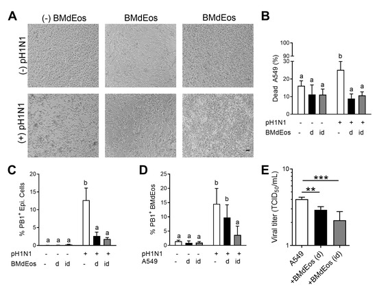 Eosinophils protect the epithelial cell barrier during influenza virus infection. (A) Representative images of A549 cell monolayers in each culture condition. (B) Percentage of dead A549 cells in the culture conditions. (C) Influenza internal protein (PB1) expressing A549 cells and (D) bone marrow-derived eosinophils in each culture condition. (E) Influenza A virus (pH1N1) titer in the supernatants. Experiments independently repeated three times for rigor and reproducibility. Data are represented as the mean and standard deviation of n = 5–6 samples analyzed by two-way ANOVA with Sidak’s multiple comparisons test. Differences are significant (p < 0.05) when letters above bars are dissimilar. ** p < 0.01 and *** p < 0.001. BMdEos—bone marrow-derived eosinophils; d/D—direct contact; id/ID—indirect contact.