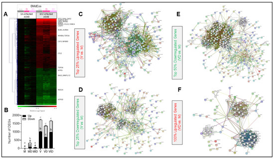 Eosinophils affect the epithelial transcriptome during influenza virus infection. (A) Microarray analysis of the A549 cell transcriptome during mock or influenza virus (IAV) infection when in direct (d) or indirect (id) contact with bone marrow derived eosinophils (BMdEos). Heat map contains log2 signal values for 1969 individual samples normalized to the row mean log2 signal value for samples M1-M4 (Mock-infected, no BMdEos). Dendrogram (left side) shows hierarchical clustering of genes by complete linkage based on euclidean distance. (B) The number of differentially expressed genes (DEGs) in each group relative to the average expression in the M group shown as a stacked bar representing the mean and standard deviation. Up- and down-regulated genes were compared across the groups by 2-way ANOVA with Tukey’s multiple comparisons test where letters above bars represent p < 0.05 when different. Protein interaction networks generated by STRINGdb are shown for: (C) Top 25% of upregulated genes (281 DEGs) between mock-infected and IAV-infected epithelial cells with no BMdEos exposure; network required an edge confidence score ≥0.700 and contains an additional 20 s shell nodes (white). (D) Top 25% of downregulated genes (212 DEGs) between mock-infected and IAV-infected epithelial cells with no BMdEos exposure; network required an edge confidence score ≥0.400 and contains an additional 30 s shell nodes (white). (E) Top 50% of downregulated genes (267 DEGs) between mock-infected and IAV-infected epithelial cells with direct BMdEos exposure; network required an edge confidence score ≥0.400 and contains an additional 55 s shell nodes (white). (F) All upregulated genes (91 DEGs) between mock-infected and IAV-infected epithelial cells with direct BMdEos exposure; network required an edge confidence score ≥0.400 and contains an additional 65 s shell nodes (white). For closer inspection, individual PNG files of the protein interaction networks shown in C-F are provided in Supplementary Materials as Figures S1C, S2D, S3E, and S4F. Please note that gene expression data and pathway analysis results of these data are provided in Supplementary Materials Tables S1–S10. M—mock, V—virus, d/D—direct culture, id/ID—indirect culture.