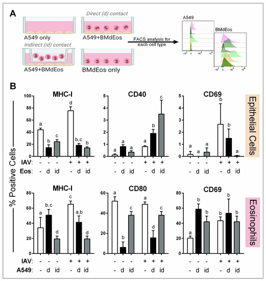 Cross activation of epithelial and eosinophils occurs in response to influenza A virus. (A) A549 epithelial cells and bone marrow-derived eosinophils were cultured directly/indirectly after infecting epithelial cells with pH1N1 influenza A virus and each cell type was analyzed by flow cytometry. Illustration with BioRender. (B) Surface expression of markers on epithelial cells and eosinophils. Data represented as the mean and standard deviation of n = 5–6 samples analyzed by two-way ANOVA with Tukey’s multiple comparisons test of one of three independent studies. Differences are significant (p < 0.05) when letters above bars are dissimilar. BMdEos—bone marrow-derived eosinophils; d—direct contact; id—indirect contact.
