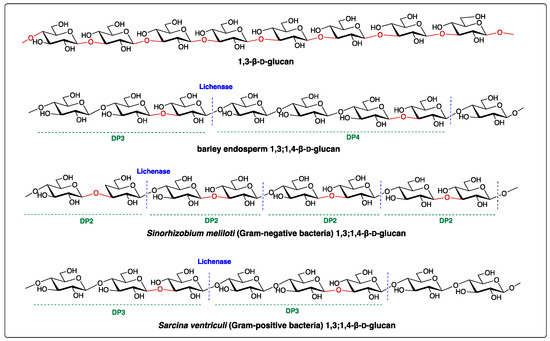 Structures of 1,3-β-d-glucan and (1,3;1,4)-β-d-glucans. Lichenase is an endo-hydrolase that hydrolyses the (1,3;1,4)-β-d-glucans into smaller oligomers, such as degree of polymerization 2 (DP2), DP3 and DP4 shown above. The blue dash lines represent the enzymatic cleavage sites. Oligosaccharide profiles in DPs vary depending on the taxonomic origin of (1,3;1,4)-β-d-glucans.