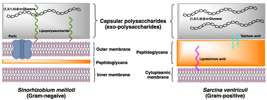Cell wall architecture of Gram-negative bacteria Sarcina ventriculi and Gram-negative bacteria Sinohizobium meliloti. Both species have unique capsular polysaccharide (1,3;1,4)-β-d-glucans deposited on the surface of bacteria.