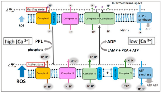 Hypothesis: Variable binding of NDUFA4 to complex I or cytochrome c oxidase (COX) in the mitochondrial respiratory chain. It is assumed that, in the resting state, phosphorylation (P) of complex I and COX (complex IV) by a cAMP-dependent protein kinase A (PKA) at low cytosolic calcium (<1 µM) stabilizes binding of NDUFA4 to complex I and induces “allosteric ATP inhibition” of dimeric COX. In the active state, stress-induced increase of cytosolic calcium (> 1 µM) dephosphorylates complex I and COX via a calcium-activated protein phosphatase (PP1), accompanied by monomerization of COX, changed binding of NDUFA4 from complex I to monomeric COX, and switching off its allosteric ATP inhibition. Note, in the “active state”, there is higher proton pumping (H+) and ATP synthesis, but ROS production is also increased (blue arrow). Modified from Figure 1 in [92].