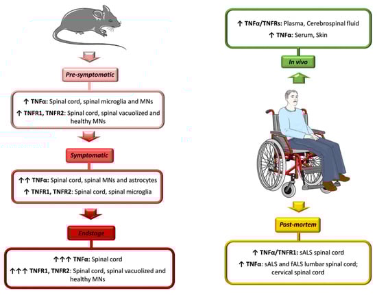 Hensley et al. displayed a three-fold increase in the amount of TNFα in the spinal cord of SOD1G93A mice at the symptomatic stage of ALS when compared to age-matched non-transgenic mice. This was associated to a strong up-regulation of TNFR1 at the late pre-symptomatic phase [65,107].