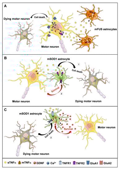 Using primary mFUS astrocytes co-cultured with primary motor neurons, the same group of researchers found that mutant astrocytes release also a large amount of toxic factors. sTNFα was identified as one of the most abundantly secreted. The latter acted as a paracrine mediator driving damaging actions on neighboring motor neurons. More specifically, the authors observed reduced neurite length and significant neuronal loss that were rescued by targeting sTNFα with a neutralizing antibody. In addition, inhibiting the activation of NFκB reduced TNFα secretion by mFUS astrocytes, preventing motor neuron degeneration and suggesting once again the existence of a positive feedback loop that correlates NFκB and TNFα. Further, mFUS astrocytes triggered changes in the expression levels of the AMPA receptor subunits GluA1 and GluA2. In particular, they found increased GluA1 and decreased GluA2 expression in dendrites of motor neurons, which resulted in increased calcium influx leading to excitotoxic damage and cell death. Even in this case, astrocytic TNFα was the paracrine mediator responsible for AMPA receptor changes, which were prevented by TNFα neutralization [117] (Figure 2A).