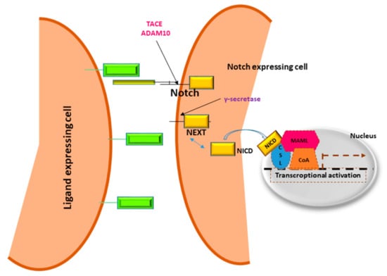 In 1911, Morgan and colleagues described a Drosophila with a notch on a wing margin caused by a heterozygous deletion of a gene located on the X chromosome that was consequently named “NOTCH” []. Many years later an initial description of Notch structure and functions was provided by Wharton and colleagues and it was shown to be a conserved intracellular pathway involved in a variety of cellular processes []. Despite the simplicity of its activation, a fine regulation of Notch signaling is required to avoid pathological effects including cancer development. Four Notch receptors (Notch1, Notch2, Notch3, Notch4) have been identified in humans. These receptors transduce signals by interacting with transmembrane ligands of the Delta-like (DLL1, 3 and 4) and Jagged (Jagged1 and 2) protein family on neighboring cells []. Once processed in the Endoplasmic Reticulum and in the Golgi, Notch receptors migrate to the cell membrane where they are activated by ligand interaction [,]. Upon ligand binding, the Notch receptor is cleaved by the protease ADAM10 or by TACE. The resulting fragment, called Notch extracellular truncation (NEXT), is then cleaved by γ-secretase and the Notch Intra Cellular Domain (NICD) is translocated to the nucleus allowing the transcription of Notch target genes including the Hairy enhancer of split homologs’ transcription factors (Hes and Hey) [,] (Figure 1). Low levels of NICD are sufficient to activate transcription because it acts as a transcriptional coactivator on the RBP-JK factor constantly bound to the promoter of target genes []. The activation of Notch signaling is finely regulated in different tissues driving organ morphogenesis during development [].