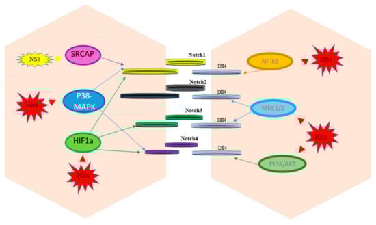 Proteins encoded by HBV (HBx) and by HCV (NS3) activate different cellular pathways that mediate the up-regulation of Notch receptors and ligands (Dll4).