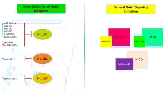 Non-coding RNAs regulating Notch Signaling. non-coding RNAs, including miRNAs and lncRNAs, target Notch signaling through mechanisms that directly regulate the expression of one of the Notch receptors (left panel) or by inhibition of proteins involved in the Notch signaling pathway (right panel). The red arrow indicates down-regulation while the blue one indicates up-regulation.