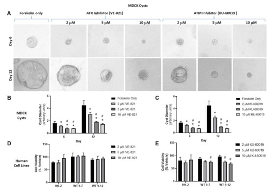 Effect of VE-821 (ATR inhibitor) and KU-60019 (ATM inhibitor) on three-dimensional (3D) Madin-Darby canine kidney (MDCK) cyst growth and cell viability (MTT assay) in human kidney tubular cell lines. (A) Representative images of MDCK cysts treated with forskolin alone, VE-821 (2, 5, and 10 µM) or KU-60019 (2, 5, and 10 µM) on Days 6 (upper panel) and 12 (lower panel) (Images were obtained using 10x objective). (B) and (C) Mean cyst diameter of MDCK cysts on Days 6 and 12, treated with either VE-821 or KU-60019 as determined by image analysis; (D) and (E) Mean number of viable cells (as a percentage of vehicle, measured by the MTT assay) in HK-2, WT 9-7, and WT 9-12 cells treated with either VE-821 (2, 5, and 10 µM, (D)) or KU-6001 (2, 5, and 10 µM, (E)) for 24 h. * p < 0.05 compared to forskolin alone, # p < 0.05 compared to 2 µM by one-way ANOVA, followed by post hoc analysis with the Tukey–Kramer HSD test. Data presented as means ± SD (n = 3 per group).