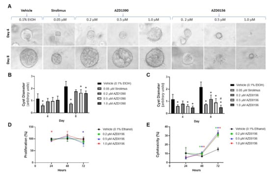 Effect of ataxia-telangiectasia mutated (ATM) inhibitors (AZD1390 and AZD0156) on MDCK cyst growth, cell proliferation and cytotoxicity in vitro. MDCK cysts were treated with either vehicle (0.1% ethanol (EtOH), sirolimus (0.05 μM), AZD1390 (0.2, 0.5, and 1 μM) or AZD0156 (0.2, 0.5, and 1 μM) for up to 8 days. (A) Representative images of MDCK cysts treated with either vehicle, sirolimus, AZD1390 or AZD0156 on Days 4 (upper panel) and 8 (lower panel) (Images were obtained using 10× objective). (B) and (C) Mean cyst diameter in response to AZD1390 (B) and AZD0156 (C) on Days 4 and 8. * p < 0.05 compared to vehicle, and # p < 0.05 compared to 0.2 µM of respective treatment. (D) Mean cell proliferation (measured by the BrdU assay) and (E) Mean percentage cytotoxicity (measured using the LDH assay) following treatment with either AZD0156 or vehicle. * p < 0.05 compared to vehicle (color of asterix corresponds to the respective line color). All p-values in figure were determined by one-way ANOVA, followed by post hoc analysis with the Tukey–Kramer HSD test, and data presented as means ± SD (n = 6 per group).