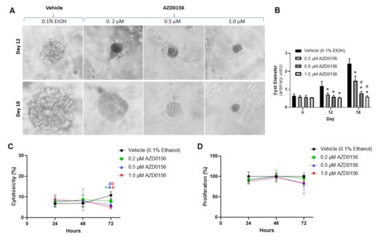 Effect of AZD0156 (ATM inhibitor) on in vitro cyst growth in human ADPKD cells. Human ADPKD cysts derived from WT 9-12 cells were treated with either vehicle [0.1% ethanol (EtOH)] or AZD0156 (0.2, 0.5, and 1 μM) for 18 days. (A) Representative images of human ADPKD cysts treated with AZD0156 on Days 12 (upper panel) and 18 (lower panel) (Images were obtained using 10x objective). (B) Mean Cyst diameter on Days 6, 12, and 18 in the experimental groups. * p < 0.05 compared to vehicle, and # p < 0.05 compared to 0.2 µM AZD0156. (C) Mean percentage cytotoxicity (measured using the LDH assay) and (D) Mean cell proliferation (measured by the BrdU assay) following treatment with either AZD0156 or vehicle. * p < 0.05 compared to vehicle and # p < 0.05 compared to 0.2 µM AZD0156 (color of asterix/hash corresponds to the respective line color). All p-values in figure were determined by one-way ANOVA, followed by post hoc analysis with the Tukey–Kramer HSD test, and data presented as means ± SD (n = 6 per group).