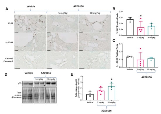 We next evaluated the short-term in vivo effect of AZD0156 on biomarkers of cystic kidney disease in Pkd1RC/RC mice. Treatment with AZD0156 for a total of 10 days had no adverse effects on general health or body weight in Pkd1RC/RC mice (change in body weight from day 0 to 10: vehicle: 0.18 ± 0.63, AZD0156 5 mg/kg: −0.38 ± 0.48, and AZD0156: 20 mg/kg: −0.18 ± 0.53 g; p > 0.05). In Pkd1RC/RC mice, AZD0156 reduced renal cell proliferation, measured by Ki-67, compared to vehicle (Figure 4A,B). In contrast, although the DNA damage marker γ-H2AX was not different between treatment groups (Figure 4A,C), AZD0156 increased renal p53 (Figure 4D,E). Due to the essential role of ATM in apoptosis [], cleaved caspase-3 (Asp175) was also investigated. Cleaved-caspase-3 was expressed in distal tubules but was not altered by AZD0156 (Figure 4A). Furthermore, due to the short duration of this study, as expected, no changes in kidney enlargement and percentage cyst area were observed following AZD0156 treatment (Figure 5).