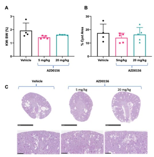 Effects of AZD0156 (5 or 20 mg/kg/day) via oral gavage for 10 days on body weight, kidney enlargement and cyst area in Pkd1RC/RC mice. (A) Mean kidney weight to body weight ratio (KW: BW) in the experimental groups. (B) Mean percentage cyst area in experimental groups. (C) Representative whole-slide digital images of Periodic Acid Schiff (PAS)-stained kidney sections from mice in the experimental groups. Scale bars in top panel indicates 2.5 mm and bottom panel 0.25 mm. Data presented as means ± SD (n = 4–5 per group).