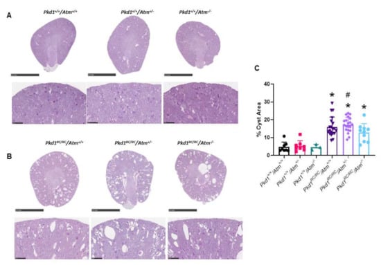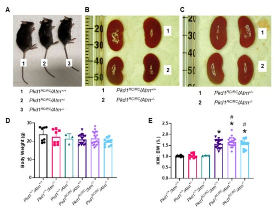 All statistical analyses were performed using JMP® Pro (v14.2.0, SAS Institute, Cary, NC, USA). Data were reported as means ± standard deviation (SD). Where appropriate, differences between groups were determined by 2-sample Mann–Whitney U test, 2-sample independent t-test, or one-way analysis of variance (ANOVA), followed by post hoc analysis with the Tukey–Kramer HSD test. Significance was defined as p < 0.05. The sample size for animal studies was determined based on kidney weight variation from a historical dataset of Pkd1RC/RC mice [] and with consideration of the combined BL/6 and 129 background of the ATM−/− mice, as described previously [].