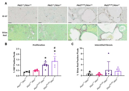 Effect of loss of ATM on renal fibrosis and proliferation in Pkd1RC/RC mice at 3 months of age. (A) Representative histological images of Sirius Red deposition (upper panel) and Ki-67-positive staining (lower panel) in the experimental groups. Scale bars, 50 µM. (B) Mean renal fibrosis score calculated by Sirius Red-positive staining. (C) Mean renal cell proliferation, as determined by quantification of Ki-67-positive staining. * p < 0.05 compared to wild-type mice (Pkd1+/+/Atm+/+) and # p < 0.05 compared to Atm genotype matched Pkd1+/+. Data presented as means ± SD (n = 4–6 per group).