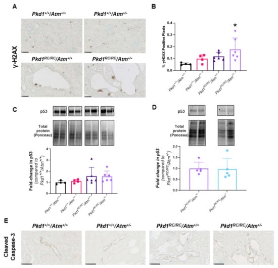 To evaluate the long-term effect of reducing ATM on kidney cyst formation and growth in vivo, we next evaluated disease progression in Pkd1RC/RC/Atm+/− mice. At 3 months of age, Pkd1RC/RC/Atm+/− and Pkd1RC/RC/Atm−/− mice appeared healthy, and body weight was comparable to Pkd1RC/RC/Atm+/+ mice (Figure 6). However, neither heterozygosity (Atm+/−) nor homozygosity (Atm−/−) for mutant Atm altered the progression of kidney enlargement or the percentage cyst area (Figure 6 and Figure 7). Similarly, no differences were also observed in these data when sub-analyzed by gender (Table S2). In addition, no changes in renal cell proliferation or interstitial fibrosis were detected in Pkd1RC/RC/Atm+/− mice compared to Pkd1RC/RC/Atm+/+ mice (Figure 8). Furthermore, at 6 months of age, no differences in body weight, kidney or heart enlargement, cystic phenotype, or percentage cyst area were observed in Pkd1RC/RC/Atm+/− mice compared to historical control Pkd1RC/RC/Atm+/+ mice (Figure S3). We also examined the downstream molecular effects of ATM loss by assessing the expression of γ-H2AX and p53 [,,]. However, neither heterozygosity or homozygosity for Atm altered the expression of either of these proteins (Figure 9). Cleaved caspase-3 was expressed in the cytosol of the distal tubules in the kidney cortex of both wild-type and Pkd1RC/RC mice and in small to medium-sized cysts in Pkd1RC/RC mice (Figure 9E). However, qualitatively, no differences were detected with Atm heterozygosity (Figure 9E).