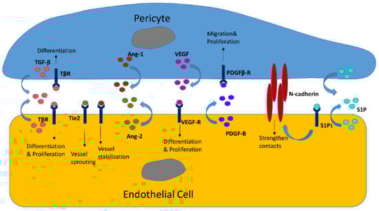 The interactions between pericytes and endothelial cells is evident not only by structure but also by function. On one hand, proliferation, differentiation, contractility, and stabilization of endothelial cells may be mediated by pericytes. During angiogenesis, a series of growth factors from pericytes such as TGF-β and VEGF stimulate the proliferation and transition of endothelial cells [58,59]. The immature basement together with proliferative endothelial cells may be stabilized by the recruitment of pericytes, building up a foundation for more proliferative endothelium [8]. Conversely, endothelial cells could also influence pericytes. Studies show that several cytokines from the endothelium may have an important role in the movement of pericytes. For instance, loss of endothelial PDGF-BB and WNT5a leads to decreased motility of pericytes and, thus, less pericyte movement toward endothelial cells [60]. Disturbance of VEGF-A could prevent the recruitment and migration of pericytes [53]. These alterations cause reduced pericyte recruitment and inhibition of angiogenesis, indicating the importance of endothelial cells for pericytes in vascular regeneration. The communication of pericytes and endothelial cells weighs importantly in the microvasculature. Overall, endothelial cells are the primary target for pericytes, and their reciprocal communications are essential for neovascularization, maintaining vascular stabilization, and other important physiological processes in the vascular network. Several crucial factors such as TGF-β, angiopoietins/Tie-2, PDGF, VEGF, and sphingosine-1-phosphate receptor (S1P1) are involved in the interactions between endothelial cells and pericytes (Figure 1) [58,59,61,62,63].