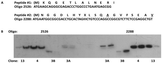 Cloning of a β-adrenergic receptor kinase (βARK) cDNA from a bovine brain cDNA library. One nmol of purified βARK was treated with CNBr, and the resulting peptides were separated and sequenced. A total of eight distinct peptide sequences were identified, with two being used in the design of oligonucleotide probes for cloning. (A) Amino acid sequence of two peptides that were consistently observed in multiple βARK preparations and the sequences of the oligonucleotide probes that were used to hybridize with cDNA libraries. The underlined residues in peptide #2 were found to be incorrect. (B) A Southern blot of several clones (3A, 3B, 4, and 13) isolated from the bovine brain cDNA library using radiolabeled oligo 2526 derived from peptide #1. Two colonies from each clone were digested with Eco RI, transferred to nitrocellulose, and probed with radiolabeled oligos derived from peptide #1 (2526) or peptide #2 (2288). The clones were sequenced, and clones 3A and 4 were found to contain a complete open reading frame. I—inosine.