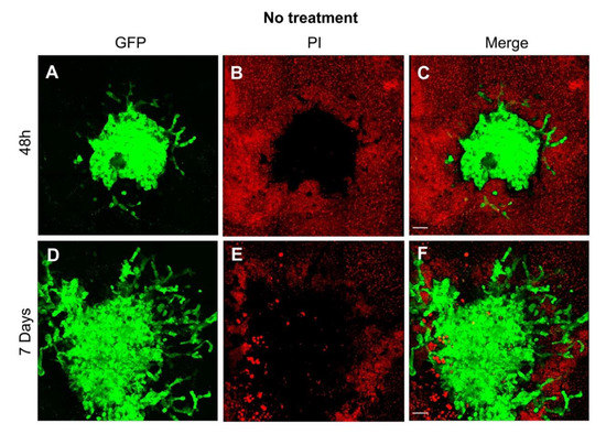 The volume of the GFP expressing tumor was quantified using Fiji [19], by manually adjusting a global threshold to separate tumor signal from the background and calculating the volume by counting foreground voxels. The data sets were visualized three-dimensionally with a 3Dscript [20]. The GFP signal is much stronger than the propidium iodide signal and bleeds into the latter channel. To make propidium iodide still visible in Figure 2, we subtracted the GFP signal from the propidium iodide channel, for illustration purposes.