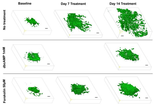 Effect of differentiation therapy on the tumor volume of the glioblastoma cell line U87 co-cultured with organotypic brain slices as quantified by two-photon fluorescence microscopy. 3D images of U87GFP+ cells transplanted bilaterally onto the CA3 region of the hippocampus before, 7, and 14 days after treatment with the cyclic AMP analog dibutyryl cAMP and the cAMP activator forskolin. Scale bars represent 100 µm.