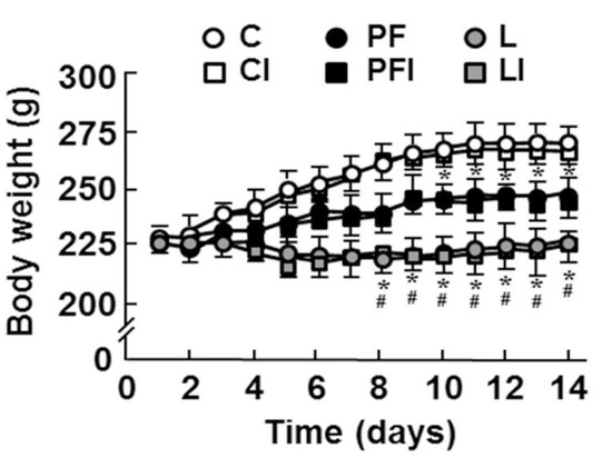 Body weight was recorded to corroborate that leptin infusion affected this parameter. On the eighth day of treatment, body weight was reduced in L and PF groups with respect to controls (Figure 1).