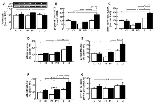Hepatic GHR protein levels were not different between the experimental groups (Figure 2A). Phosphorylation of STAT5 was reduced in the PF group and increased in the leptin plus insulin treated rats (Figure 2B; interaction leptin and insulin: F = 32.71, p < 0.001). ERK phosphorylation was also reduced in the PF group and increased after insulin in L rats (Figure 2C, interaction leptin and insulin: F = 6.82, p < 0.05). Phosphorylation of insulin receptor (IR) was increased in both groups of leptin-treated rats (Figure 2D, interaction leptin and insulin: F = 6.03, p < 0.05). Akt phosphorylation was reduced in the PF group and increased after insulin in PF and L groups (Figure 2E, interaction leptin and insulin: F = 6.41, p < 0.05). Phosphorylation of S6K was diminished in the PF group and increased in the PFI and LI groups (Figure 2F, interaction leptin and insulin: F = 8.15, p < 0.01). Finally, no changes in the activation of IGF-IR were found (Figure 1G).